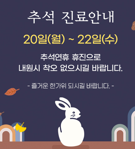 추석연휴 진료안내 페이지 정보 작성자 최고관리자 작성일21-09-08 13:56 조회3,351회 댓글0건 다음글 목록 본문 추석 진료안내9월20일 월요일 ~ 9월22일 수요일추석연휴 "휴진"으로내원시 착오 없으시길 바랍니다. 즐거운 한가위 되시길 바랍니다 ^^ 댓글목록 등록된 댓글이 없습니다. 다음글 목록